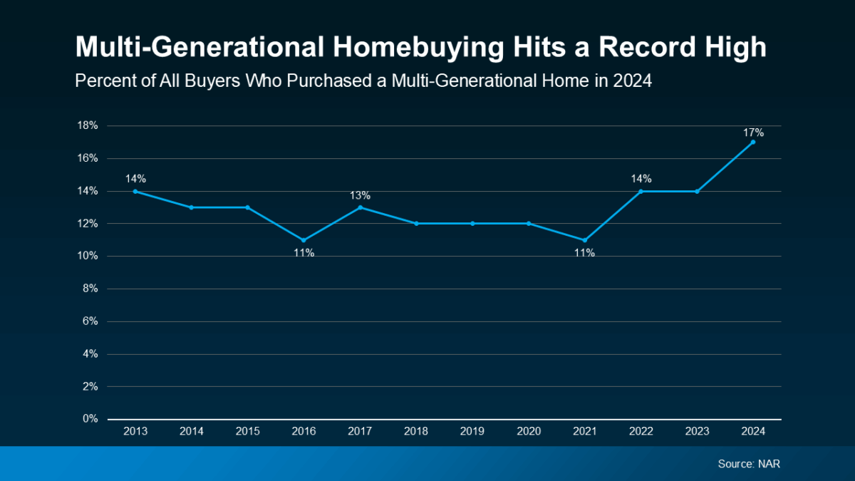 Multi-generational living is on the rise. According to the National Association of Realtors (NAR), 17% of homebuyers purchase a home to share with parents, adult children, or extended family. That’s the highest share ever recorded by NAR (see graph below):